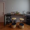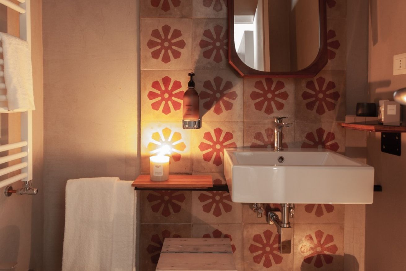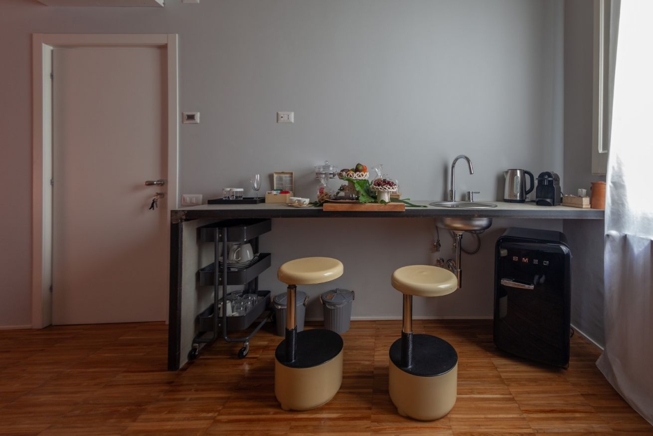Il piano cottura presente nelle suites è ricavato su un ripiano in ferro e cemento in cui un piccolo lavello, un bollitore e un mini frigo Smeg assicurano, in ogni momento, la possibilità di gustare un caffè, un tè o un drink in un’atmosfera morbida ed elegante.